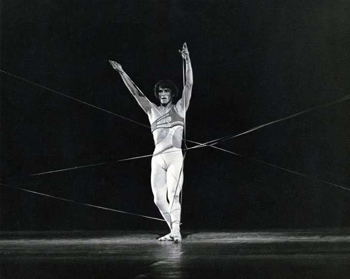 Nureyev danced more than forty roles over a period of twenty eight years with the Royal Ballet, London. "The Ropes of Time," premiered March 2, 1970, was the first full-scale ballet created specifically for Nureyev by choreographer Rudy van Dantzig. Nureyev dances the role of The Traveler, attended by a cast of Life and Death. At his request, Nureyev was onstage for the ballet's entire thirty five minutes displaying immense strength and stamina. The ballet was the first Royal Ballet production without an orchestra, danced to taped electronic music by composer Jan Boerman and featuring costumes and a futuristic set by Toer van Schayk.